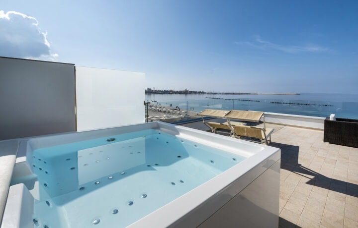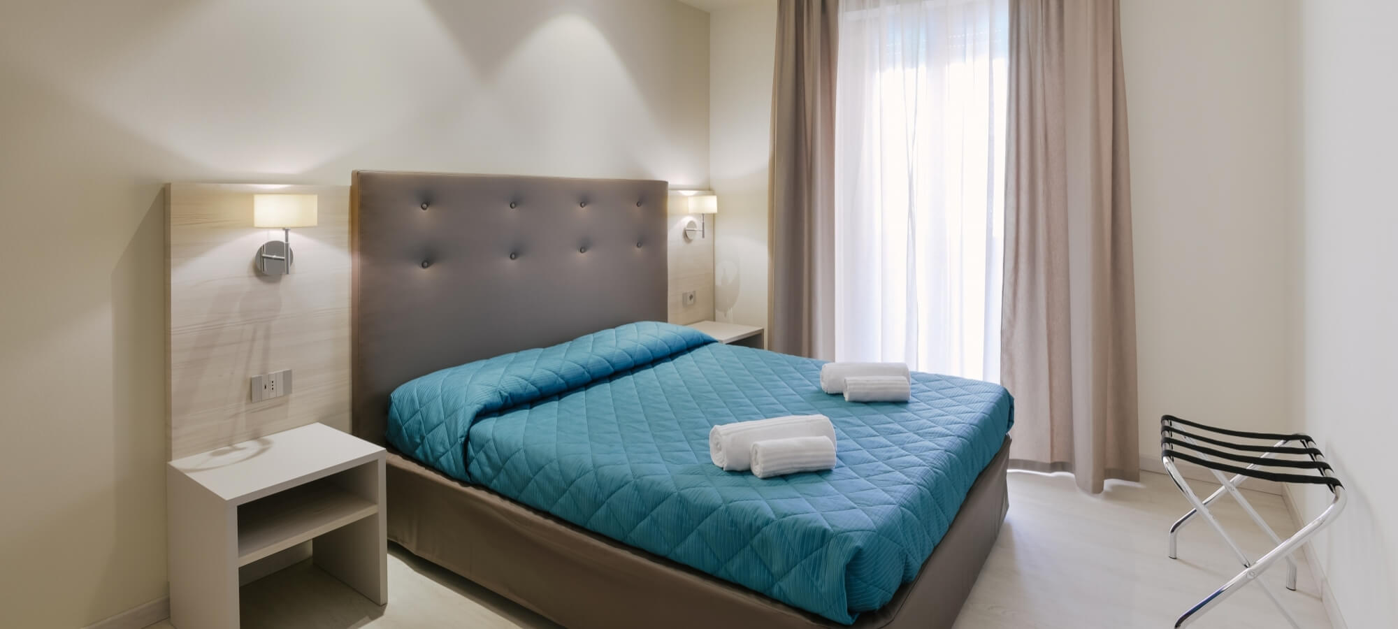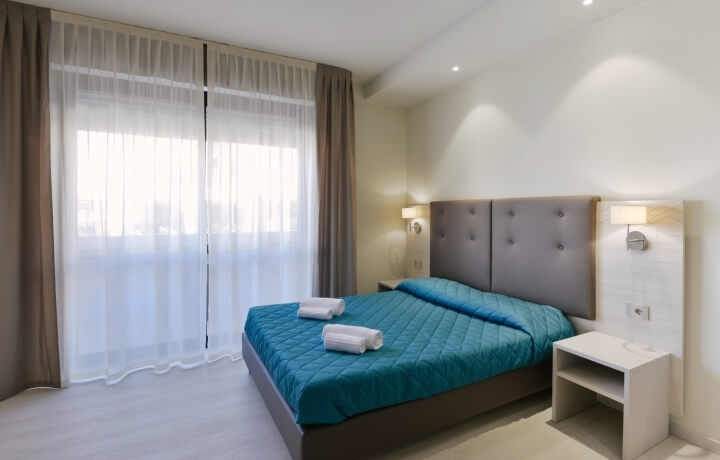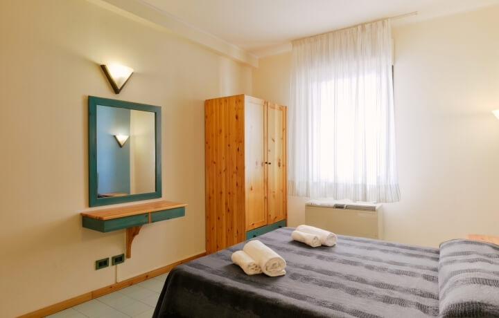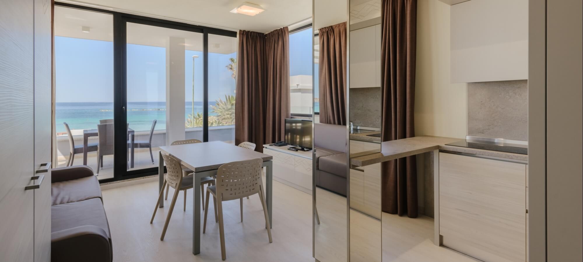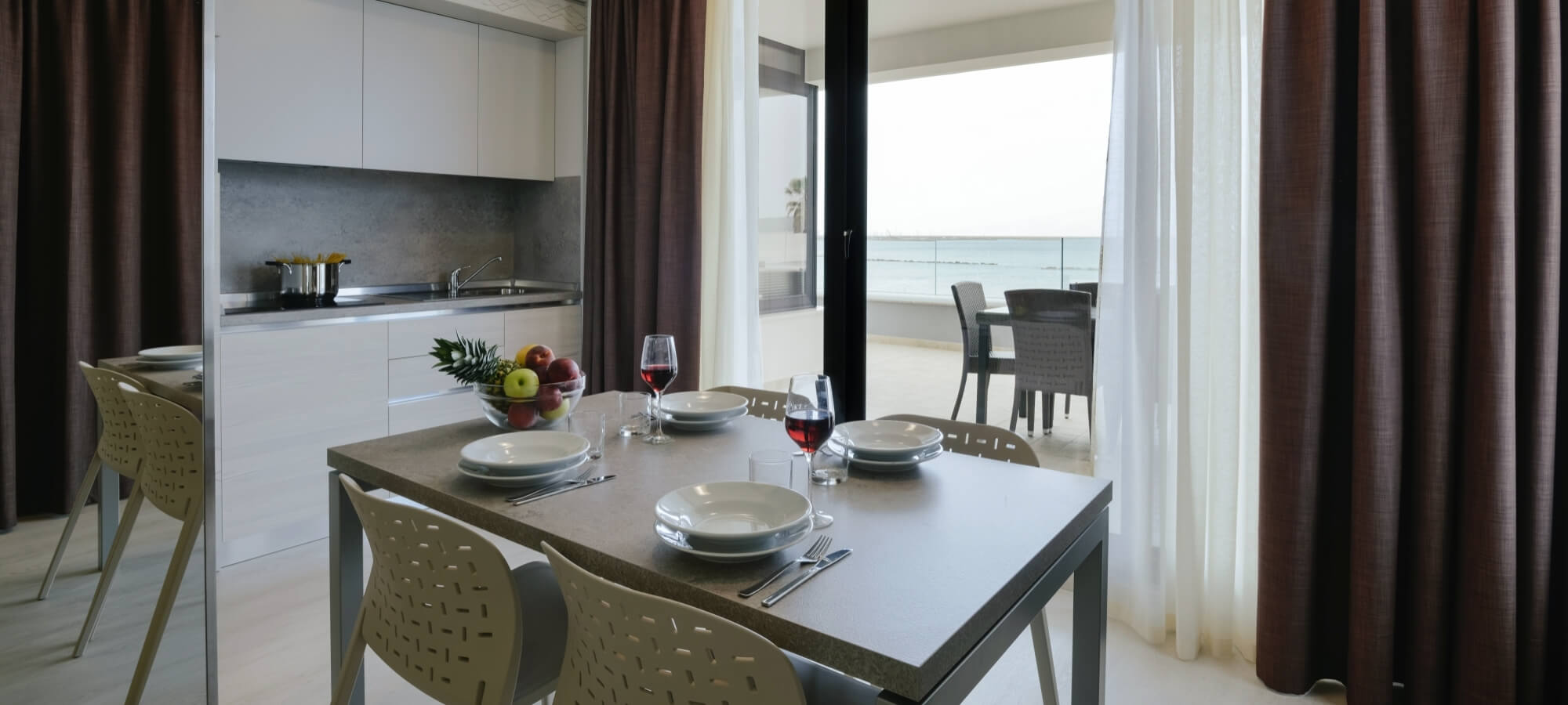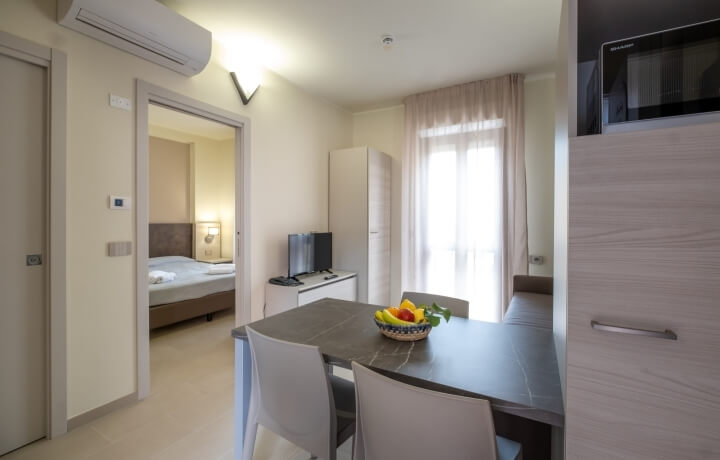The One bedroom apartment are composed of 2 environments with a living room and kitchen area equipped with a double sofa bed, 1 bedroom with a double bed, a bathroom with shower and balcony with a table and 2 chairs.