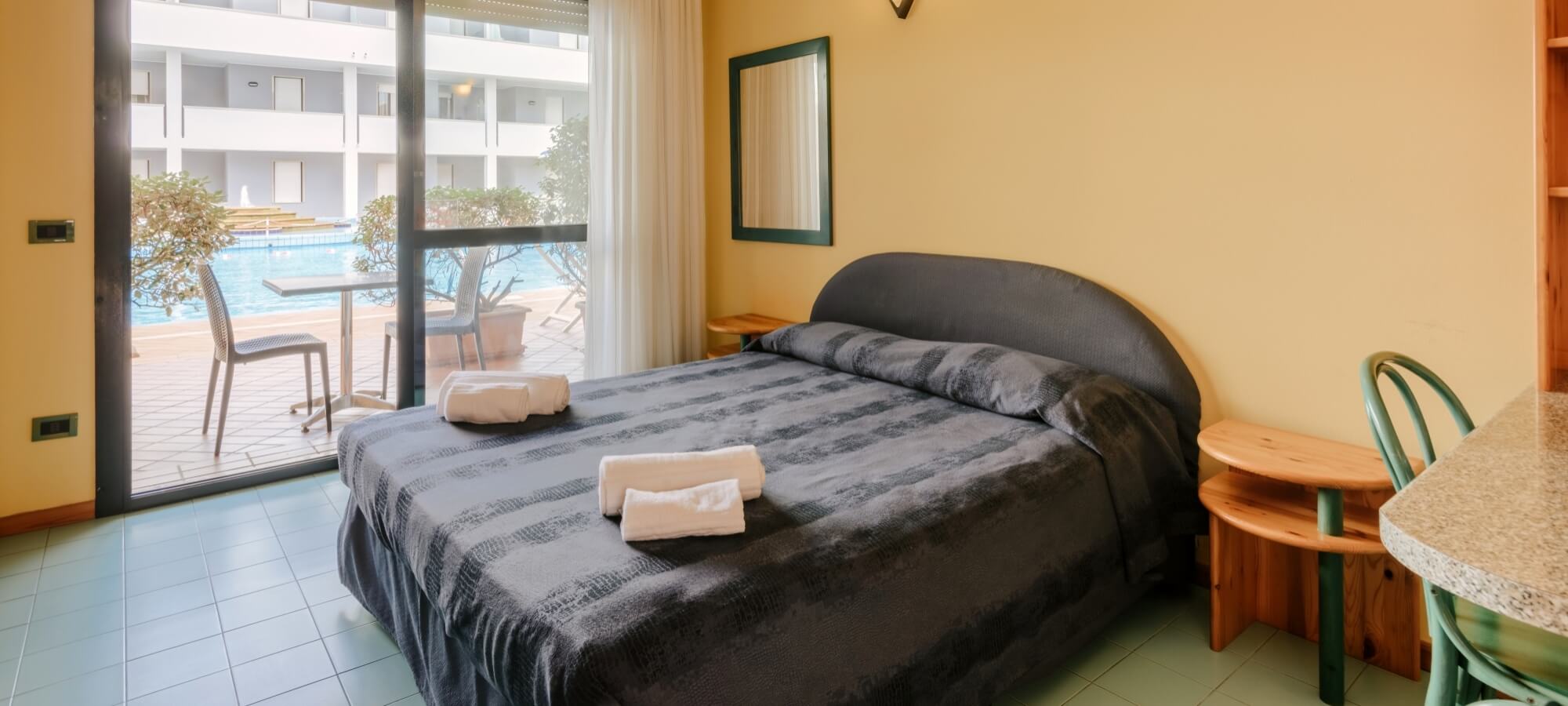 Il monolocale standard è composto da un unico ambiente con soggiorno e angolo cottura attrezzato e con letto matrimoniale, un bagno con doccia e balcone/patio con un tavolo e 2 sedie, ubicato nella zona piscina al piano terra, primo o secondo piano e privo di ascensore.